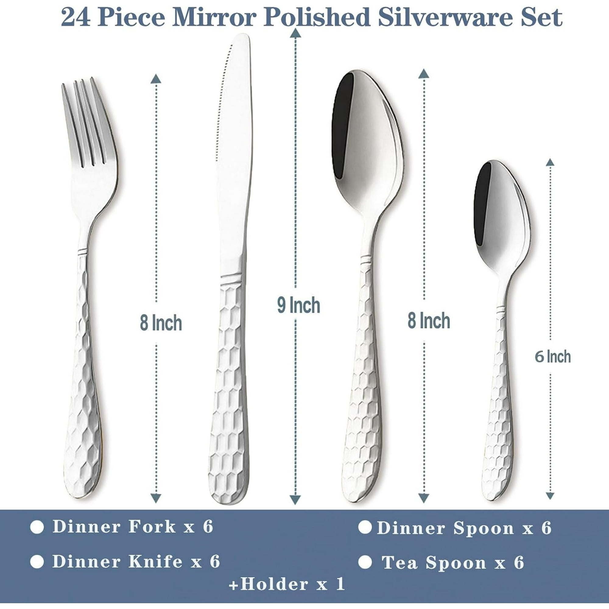 [Silverware Set For 6] 24 Pieces Cutlery Set, including 6 spoons, 6 forks, 6 knives, 6 coffee spoons and 1 gold silver tableware rack. A set of tableware that can meet the needs of daily life and is necessary for friends or family gatherings.