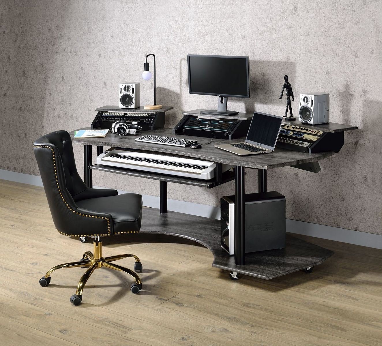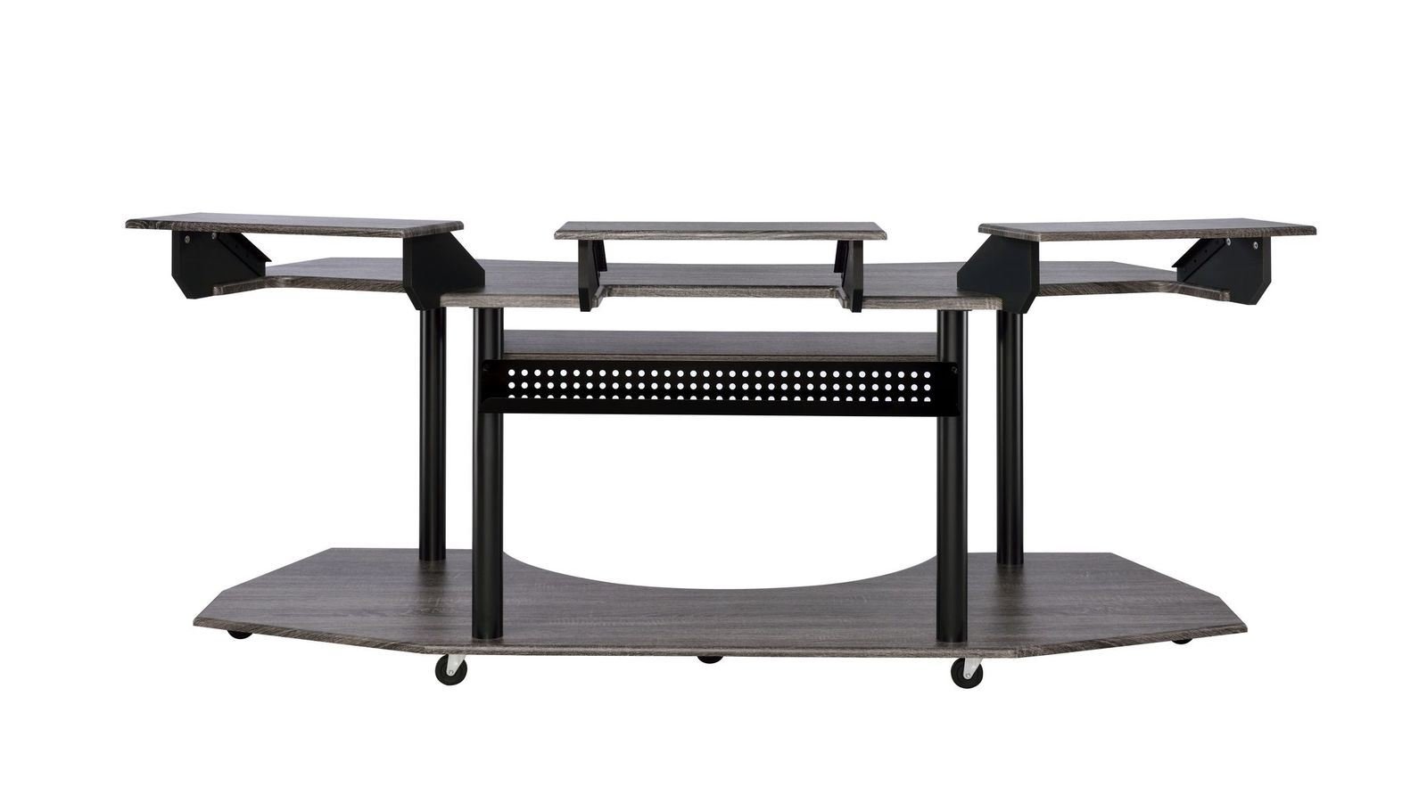 With no detail left unnoticed, this Eleazar Music Recording Studio Desk provides excellent functionality and versatile organizing options. With an extensive desk top design, plenty of workable surface area is left. The multi-function hutch is perfect for displaying monitors, speakers, documents, and books. While the lower shelf can be used to place larger items. Available in two sizes and two different finishes, this contemporary piece will sure to be the perfect addition to your home office.