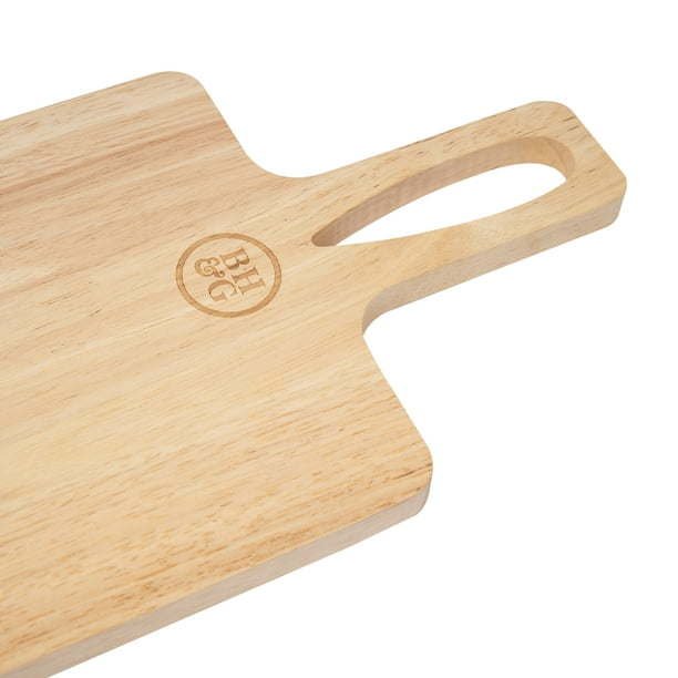 Better Homes & Gardens, Material is rubber Wood Cutting Board, Wooden Kitchen Chopping Boards for Meat, Cheese, Bread, Vegetables &Fruits, Knife Friendly Kitchen Butcher Block, 53.3 x 20.3 x 1.5cm This chopping board can be used to chop up all varieties of foods such as bread, cheeses, meats, vegetables, fruits, and pizzas. This rubber wood cutting board comes with an ergonomic non-slip handle that makes it easy to hold the board while you’re putting the chopped ingredients in the cooking pot. This ensures that your countertops remain clean and uncluttered. Heavy-Duty Chopping Board, This cutting board for the kitchen is very thick and big enough to withstand large and heavy meats like a whole turkey for Thanksgiving, as well as stand up to the demands of everyday cooking in home and restaurants.