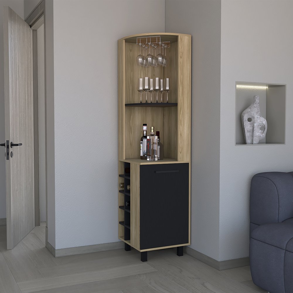 Cleveland Corner Bar Cabinet, hosting a party is now easier than ever with the Cleveland Corner Bar Cabinet! This stylish piece of furniture fits perfectly in any corner of your home and has plenty of storage space for wine, liquor, glasses, and all your other hosting supplies. With ten wine cubbies (4,4''W X 4,7''H), a one-door cabinet with two Interior shelves (10''H X 15,3''H) for more safety, and two ample superior shelves (20,8''H X 17,7''H X 16,4''W) includes four stylish legs for a contemporary style. Designed with elegant Natural Oak / Black manufactured wood finish.
