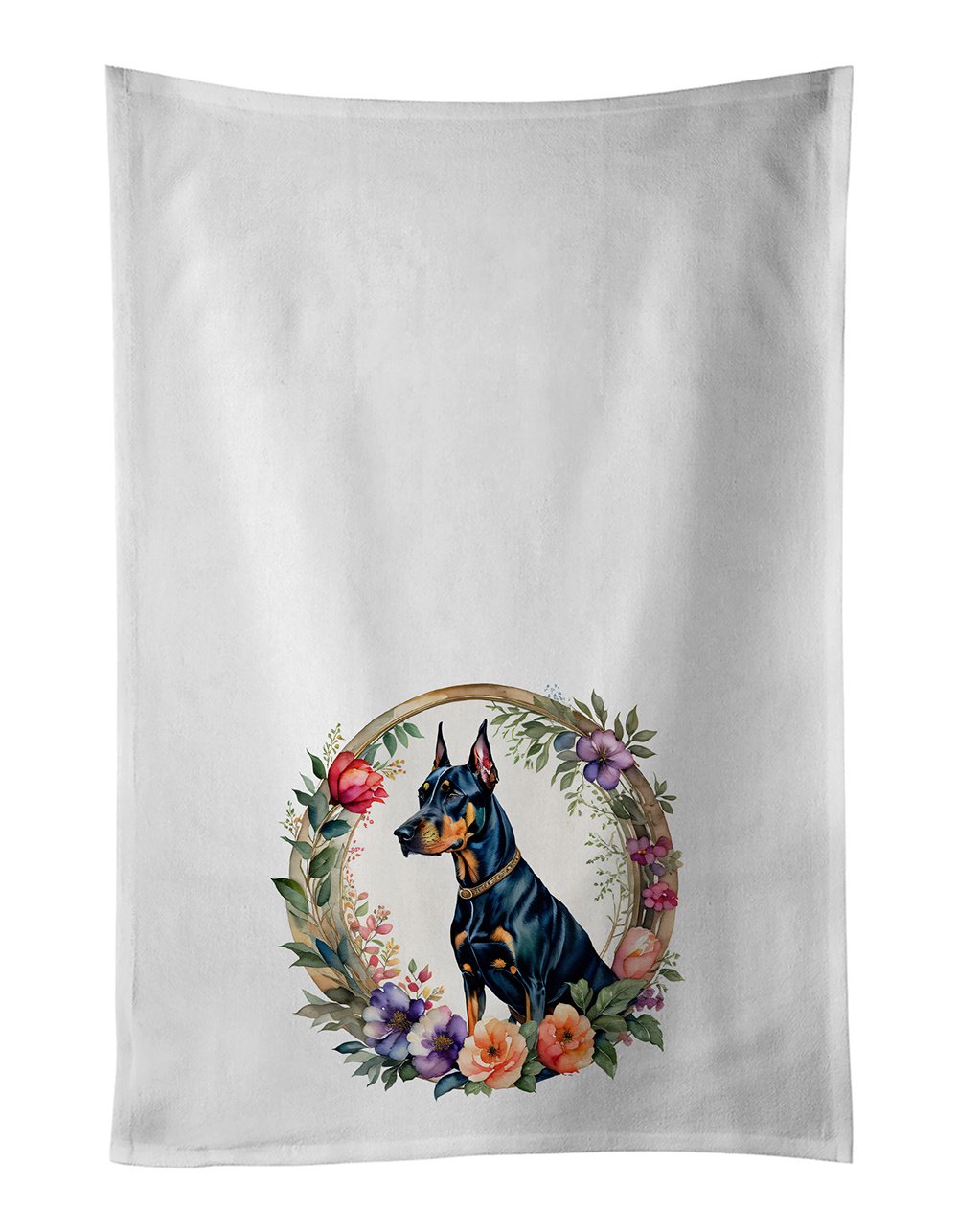 Kitchen Towel Set of 2 featuring breed specific Doberman Pinscher artwork. Spruce up your kitchen decor with Caroline's Treasures Decorative White Kitchen Towel Set. This set of two dish towels showcases beautiful artwork from one of our talented artists, making them both practical and visually appealing. These towels are crafted from 100% cotton, offering excellent absorbency and durability, making them ideal for any kitchen task. Each white towel measures 19 inches by 28 inches, providing ample coverage for drying dishes or wiping up spills. The standout feature of these towels is the full-color artwork design printed on each one. They can serve as a vibrant accent in your kitchen, turning a functional item into a delightful piece of decor. When it comes to care, these towels are machine washable in cold water and can be dried on low heat. Remember to always use a pressing cloth when pressing the design, and avoid using bleach on the decorated towel. The Decorative White Kitchen Towel Set makes a great gift or a stylish addition to your own kitchen.