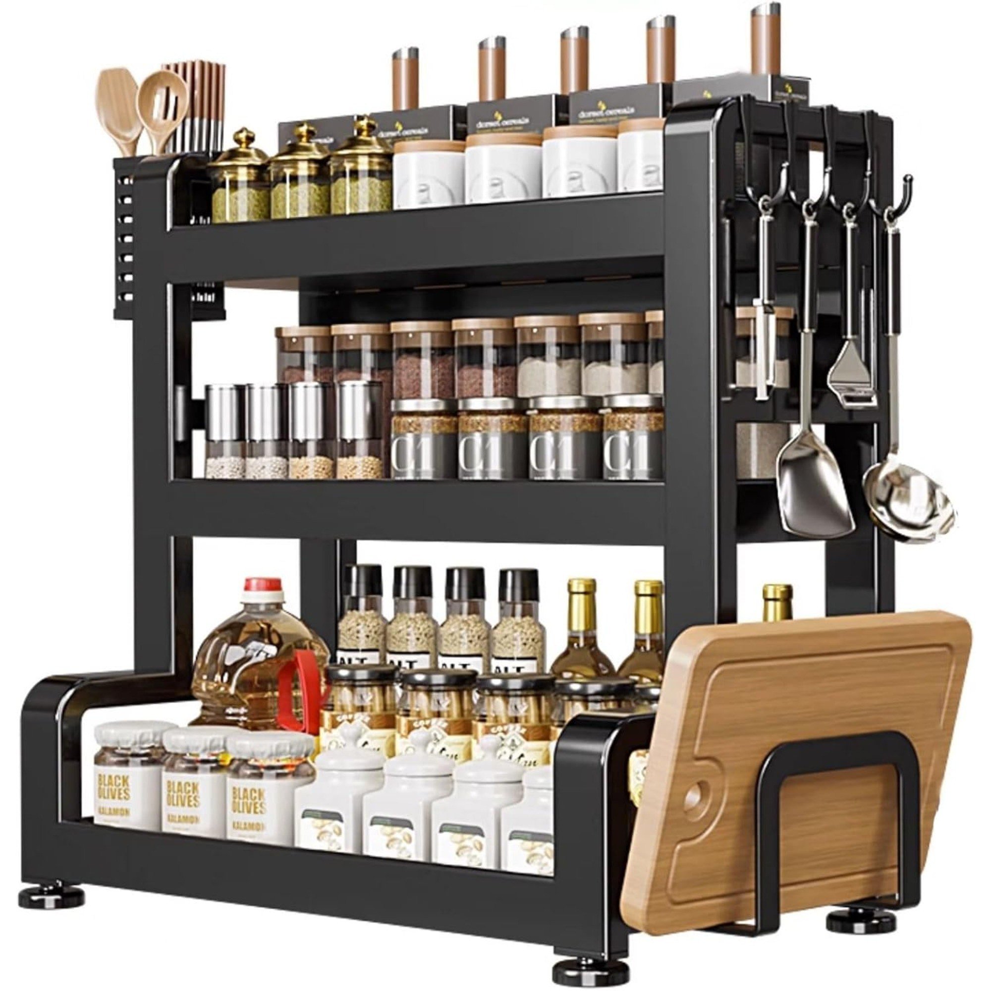 Multi-Layered Storage: This 3-tier kitchen seasoning rack provides ample space to neatly organize your seasonings, utensils, and cutlery. Maximize your countertop space efficiently.Versatile Organization: Not only for seasonings, but also suitable for holding pots, lids, and cutting boards. The hooks offer additional storage for small items like towels or spoons.Stylish and Practical: The black finish adds a modern and sleek look to your kitchen. It blends well with any decor while keeping your kitchen essentials organized.Sturdy and Durable: Made from high-quality materials, this rack is built to last. It can withstand the weight of your kitchen items without sagging or breaking.Easy Access and Visibility: The open design allows for easy access to your items and clear visibility, making it convenient to find what you need quickly while cooking.