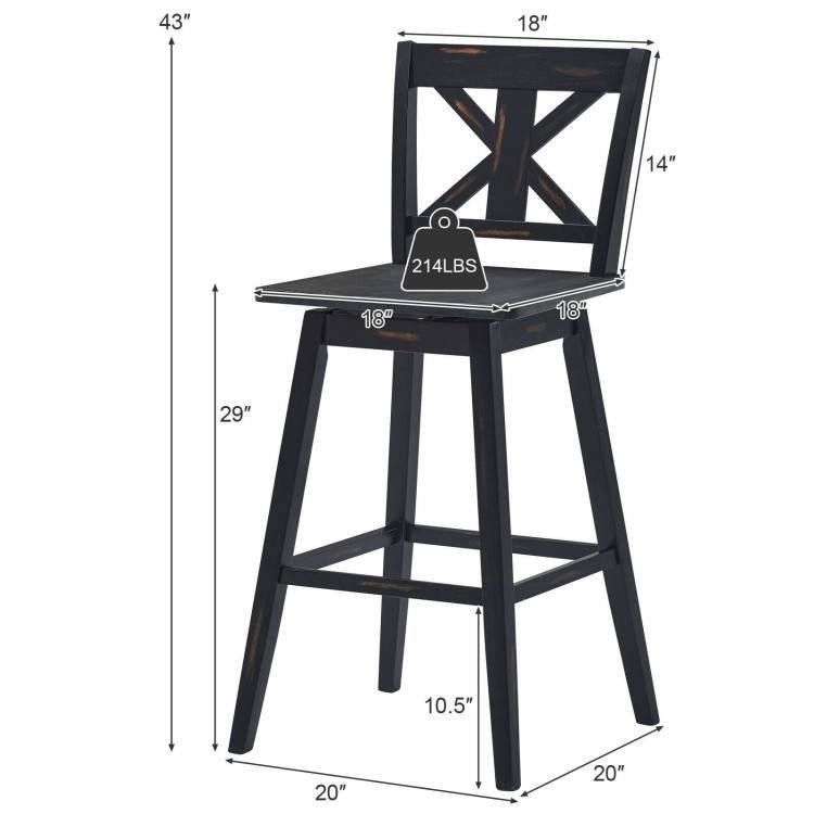 This Set of 2 Black Wood 29-in Modern Kitchen Dining Farmhouse Swivel Seat Barstools is made of premium rubberwood and features excellent sturdiness and durability. Therefore, the overall weight capacity of each bar stool has been improved to 214 lbs and you can use the set for a long time. The backrest is designed to be ergonomic and can perfectly fit your back lines. Meanwhile, the seat of the barstool also adopts a curved design, fitting your hips. In this way, your body will be well supported and fatigue can be relieved. Even sitting for a long time you will not feel very tired. The special thing is that the seat is a 360° swivel and you can spin quietly. Thanks to this feature, you can talk to your guests in different directions conveniently. Moreover, there are 2 bar stools in this set, which can meet your daily needs. In addition to your home kitchen, the bar stool set can also be placed in restaurants, bars, and bistros. Meanwhile, with a vintage design, the bar stools can also become a wonderful decoration. The set will bring a sense of fashion and freshness to your home. All needed manuals and accessories are included in the package. With these necessary tools, you can easily assemble the bar stool set. The overall dimension of each stool is 20" x 20" x 43" (L x W x H) and the seat is 29" high. During daily life, you only need to wipe it with a damp cloth regularly.
