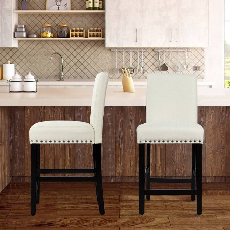 This Set of 2 Modern Kitchen Dining Barstools w/ Black Wood Legs and Beige Linen Seat would be a great addition to your home. The soft cushions of the backrest offer great softness, much more than ordinary bar stools. As well, the interior spring beneath the seat makes for great elasticity and support. The extra breathable linen fabric is amazingly durable and will provide lasting comfort. No matter how tall you are or how long your legs are, these barstool allow you to sit comfortably. The curved backrest is designed to alleviate back strain and provide extra support, while the wide seat is designed to cater to all manner of people – perfect for commercial as well as in-home use. The wood legs feature great sturdiness and enable these barstools to provide firm support. The 4 bars connecting the legs provide a footrest as well as adding to the structural integrity of the stools. Plus, there is no need to worry about any wobbling as the adjustable foot pads provide stability even on uneven floors. The various rivets around the seat add an aesthetic beauty to these bar stools. The stylish appearance makes these a perfect complement to either your dining table or kitchen counter. Use these bar stools to enjoy a drink or as dining chairs to entertain guests. The assembly process is a breeze for anyone thanks to the simple structure and easy-to-understand instructions. Requiring less time and effort, the assembly process is much easier than that of other bar stools. In addition, the solid construction provides great stability and a long life span.