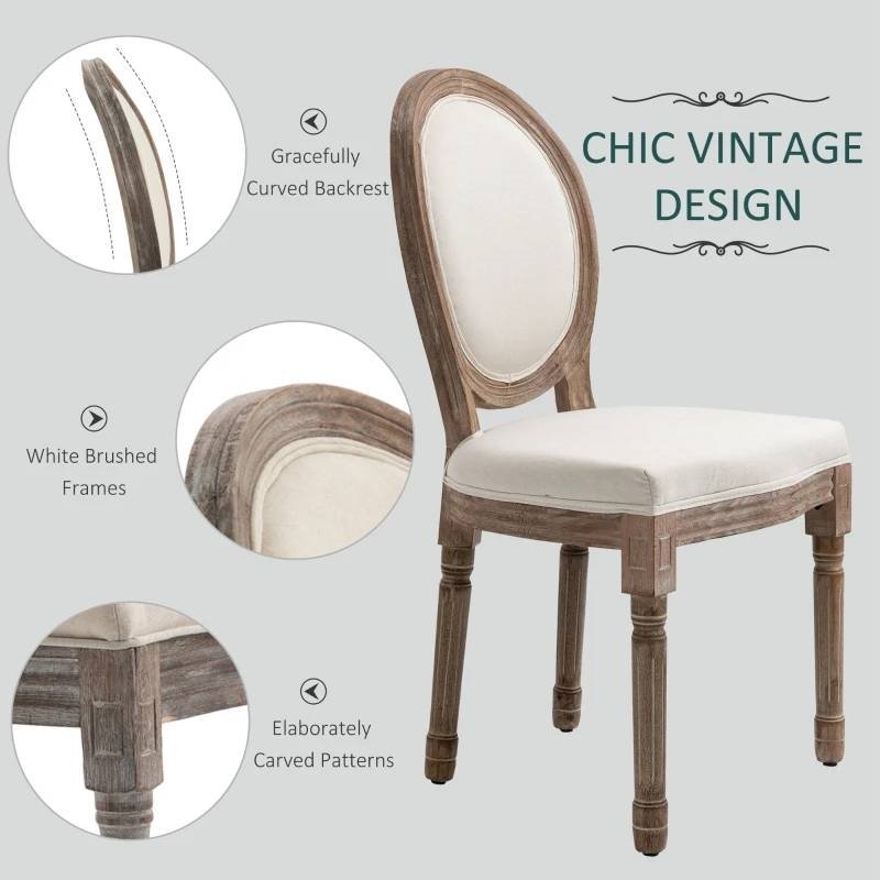 These Chic French Style Set of 2 Vintage Upholstered Armless Curved Back Dining Chairs has an elegant and rustic style, gracefully curved back, classic color scheme, and beautifully carved leg patterns. These armless chairs have a rubberwood frame and legs, and linen fabric upholstery with a high-density sponge makes these modern dining chairs breathable and provides high comfort. The padded backrest supports your back and lumbar, while the armless design allows for multiple sitting options and freedom of movement while seated. These dining set chairs work great in your dining room, kitchen, or living room. The footpads on each leg ensure you won't scuff up your hardwood or tile floors and stay in place on the carpet.