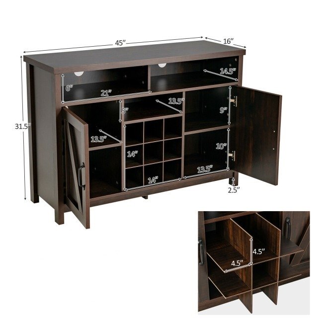 The Espresso Detachable 9 Bottle Wine Rack Kitchen Buffet Storage Cabinet features a detachable 9-bottle wine rack that offers an ideal storage solution for your wine collection. Features ample storage space with 3 open compartments and 2 door cabinets for concealed storage. Shelves inside are adjustable in height, which help customize an ideal storage space for your private items. Made of durable engineered wood, the kitchen cupboard is sturdy and durable. The 4 legs are fitted with anti-skid pads to provide excellent stability. And the bottom is equipped with extra support plate to prevent the cabinet from shaking or wobbling.