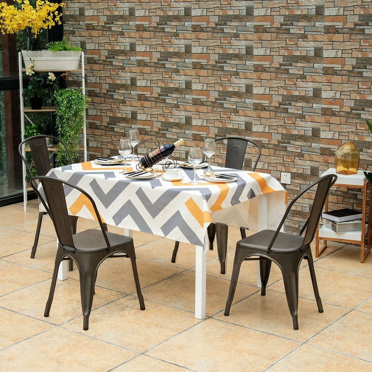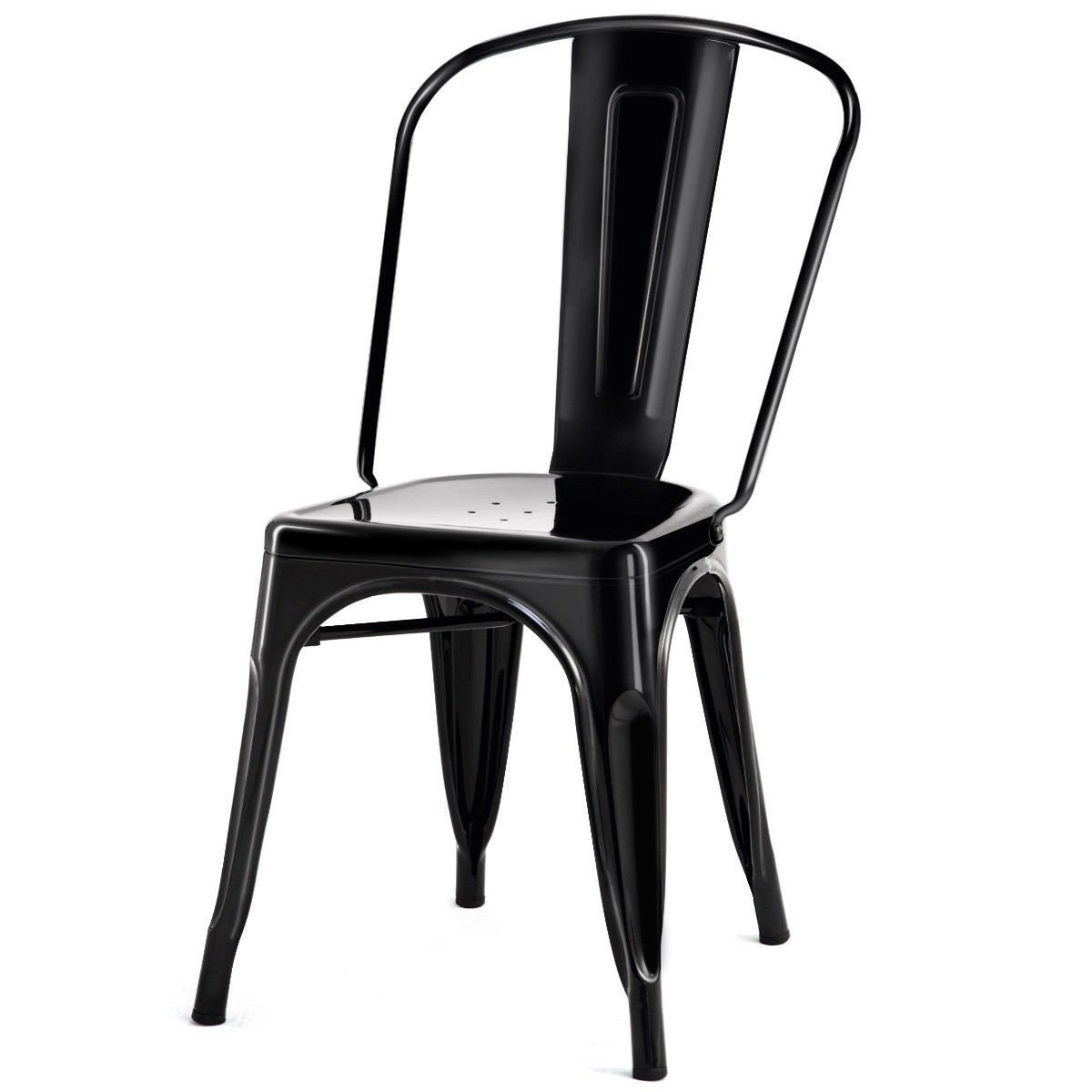 A classic touch is added to your kitchen decor with this Set of 4 Indoor Outdoor Black Metal Stacking Bistro Dining Chairs. Each chair features a high back which offers durable support needed down the center of your spine to help guard against fatigue and aches. Simple and practical, you can apply the set of chair into anywhere you can imagine, such as bistro, living room, dining room and your kitchen.