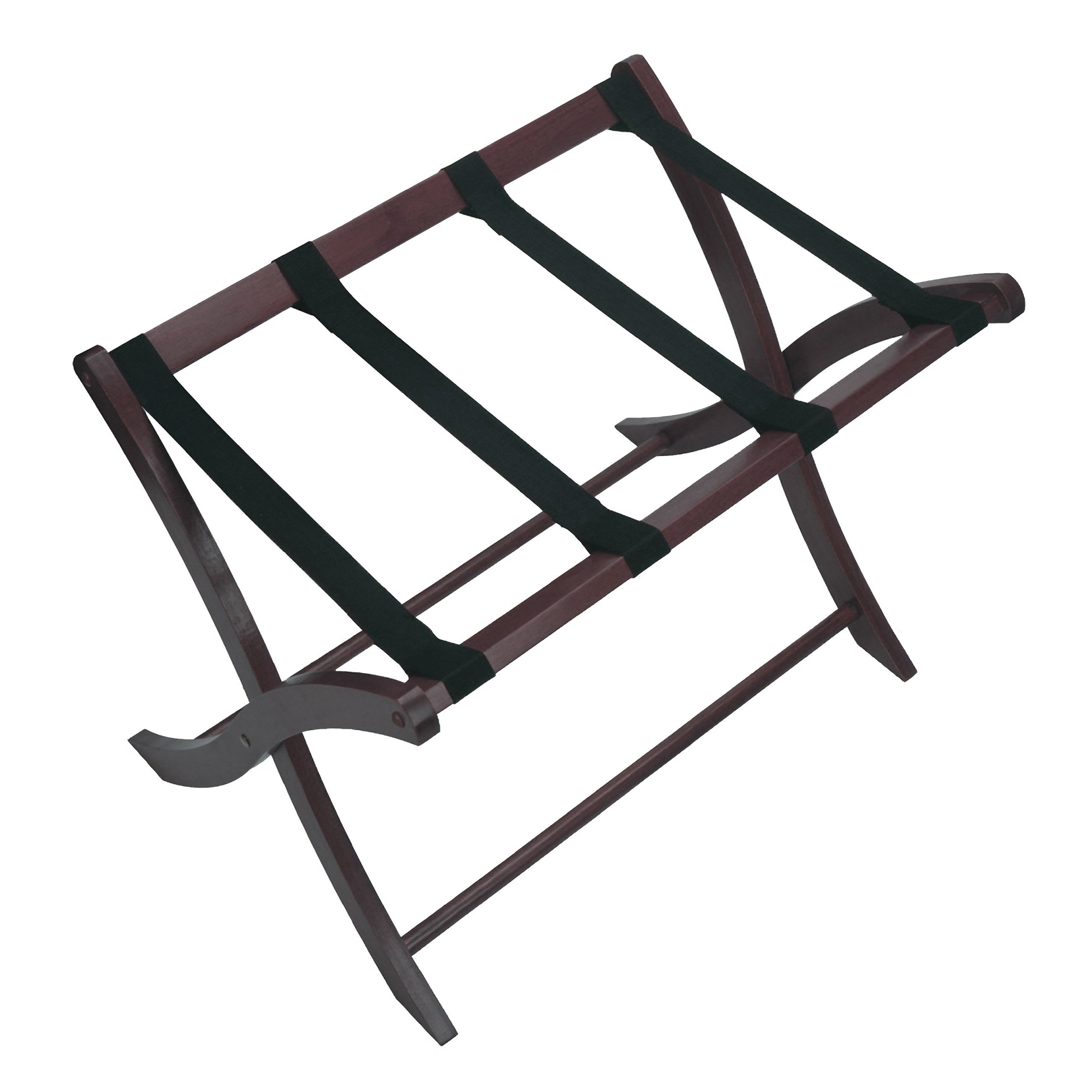 With its sturdy legs and thick canvas straps; The Scarlette Luggage Rack is perfect for holding a heavy suitcase. Its finish and curved legs make it a worthy addition to anyone's bedroom.Overall Luggage Rack open size is 26.50" Wide x 18.70" Deep x 20" High.Folded Storage size is 26.50" Wide x 4" Deep x 26.70" High.Made with solid wood in espresso finish. Nylon Black straps. No assembly Required.nullnullnull This product meets the oversized requirement per UPS/FedEx. The shipping weight reflected is the dimensional weight. This product also meets the large package requirement per UPS/FedEx. The estimated shipping cost will include this fee. Large package is $70.00; applied when length plus girth [(2 x width) + (2 x height)] combined exceeds 130 inches. Additional Handling charge of $10.50 applied where a package's longest side exceeds 48 inches in length; the second longest side exceeds 30 inches in length; or total weight is greater than 70 lbs.This product meets the oversized requirement per UPS/FedEx. The shipping weight reflected is the dimensional weight. This product also meets the large package requirement per UPS/FedEx. The estimated shipping cost will include this fee. Large package is $70.00; applied when length plus girth [(2 x width) + (2 x height)] combined exceeds 130 inches. Additional Handling charge of $10.50 applied where a package's longest side exceeds 48 inches in length; the second longest side exceeds 30 inches in length; or total weight is greater than 70 lbs.
