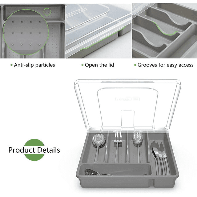 Plastic silverware tray with 5 generous compartments: multi-compartment silverware tray with lid keeps items organized and ready to use; sort knives, forks, spoons and other kitchen gadgets in orderly manner.